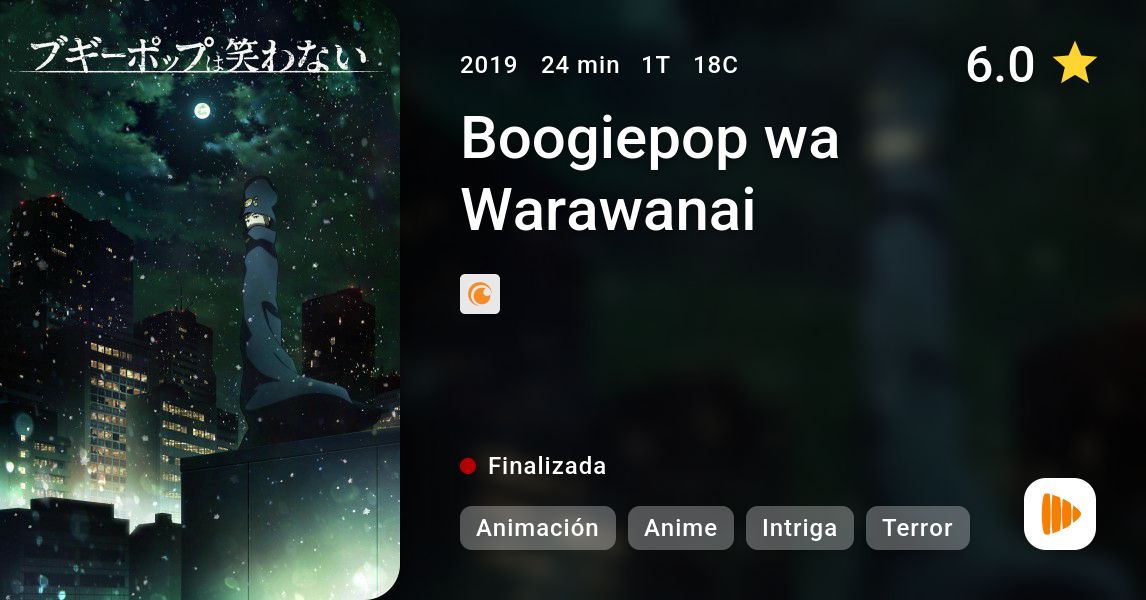 Serie de TV (2019-Actualidad). Hay una leyenda urbana que dice que existe un mensajero de la muerte que puede liberar a la gente del dolor que sufren, cuyo nombre es Boogiepop. Cuando muchas estudiantes de la academia Shinyo empiezan a desaparecer, la policía y la facultad asumen que se trata de fugas perpetradas por las mismas. Sin embargo, los alumnos saben que hay algo más detrás de esto.
